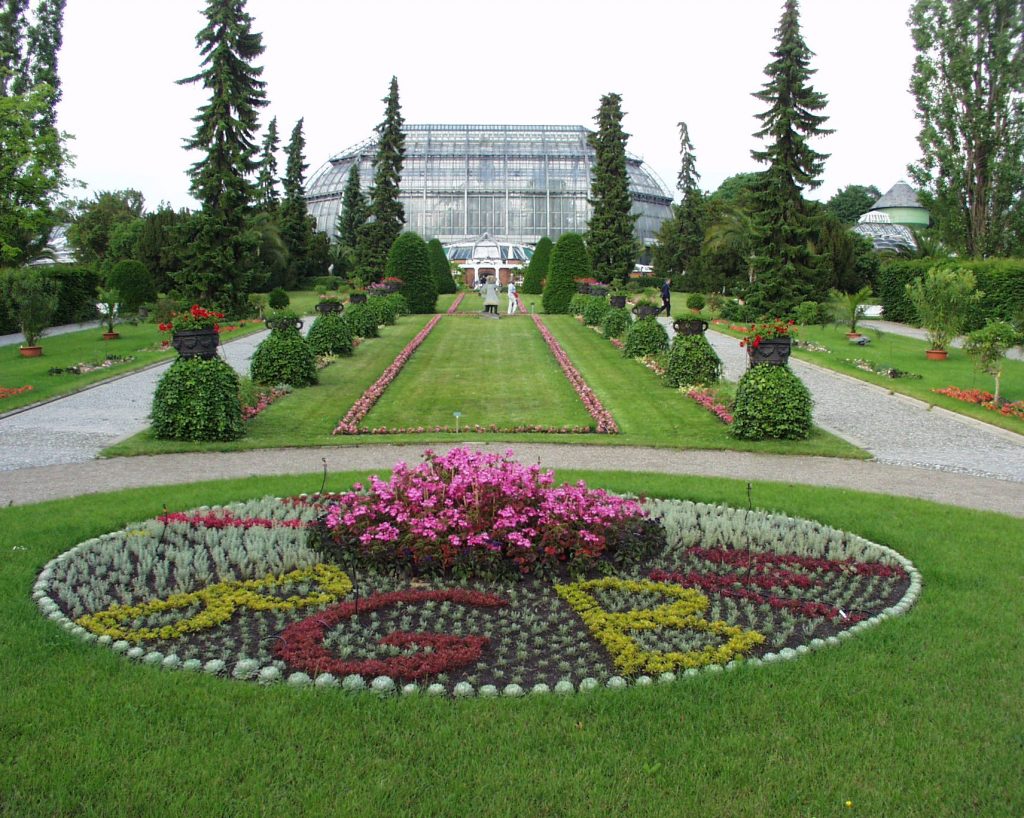 Nächstes Bild Blick auf das Große Tropenhaus Die Buchstaben BGBM im Beet gepflanzt – Botanischer Garten Botanisches Museum